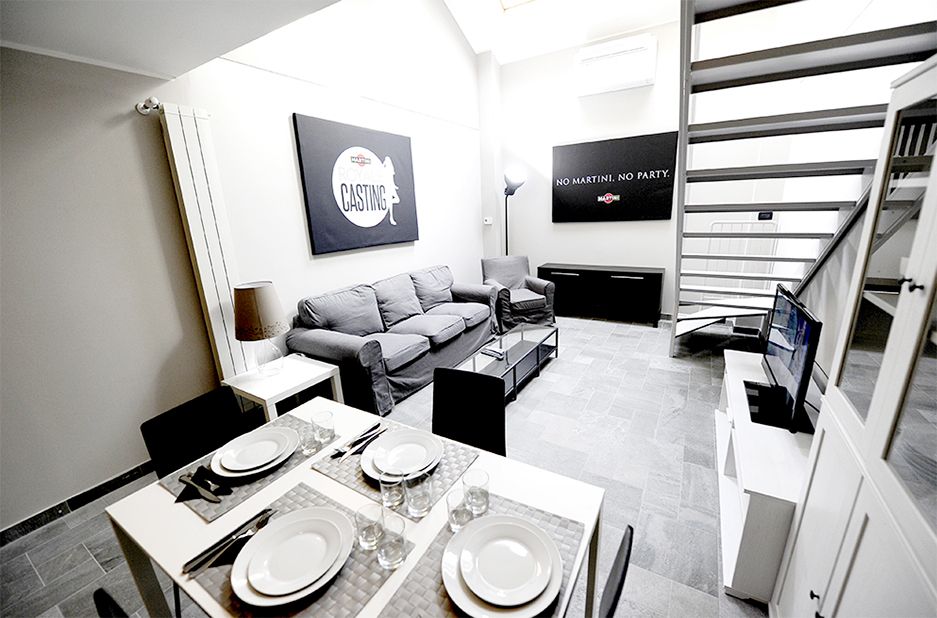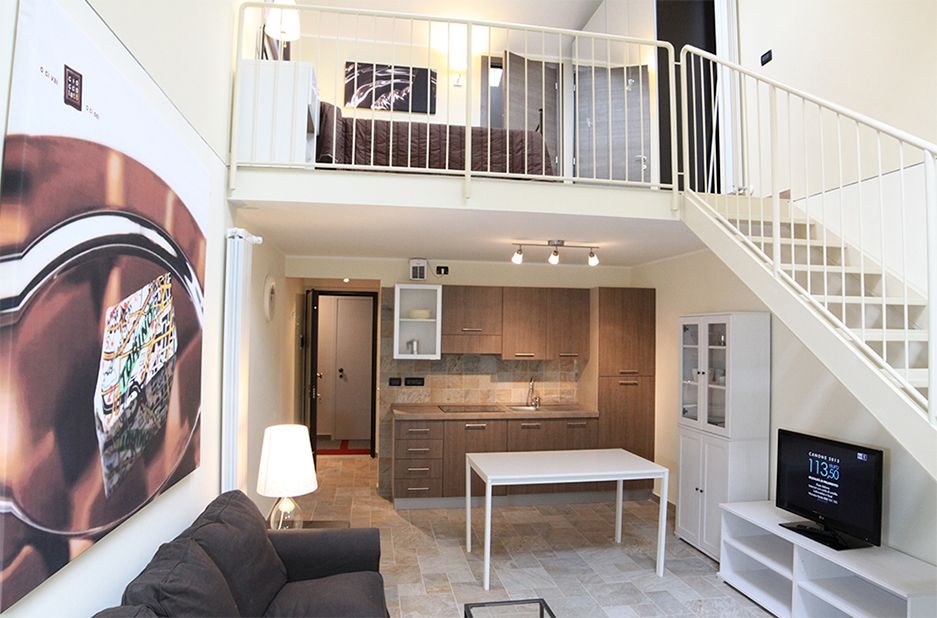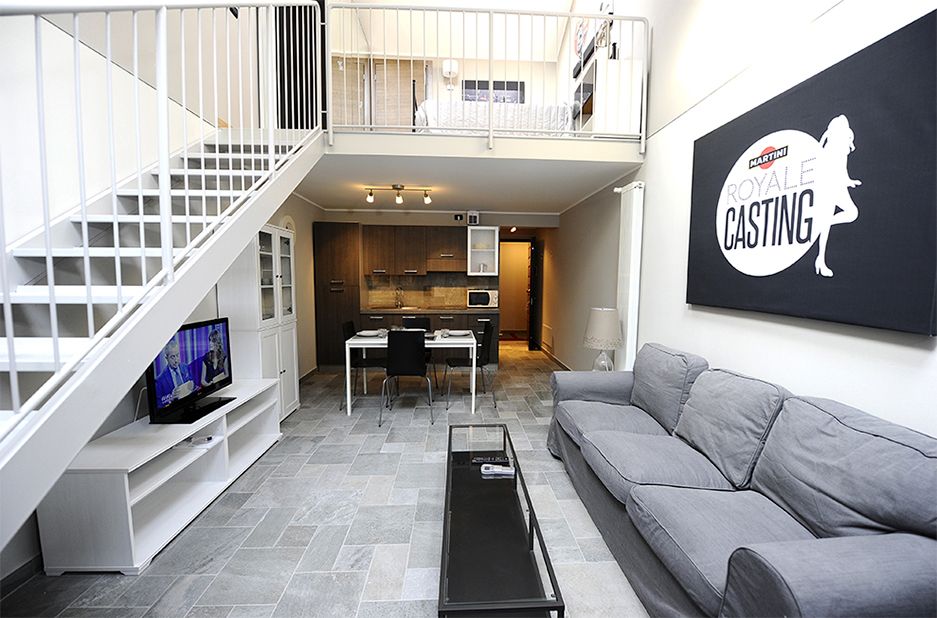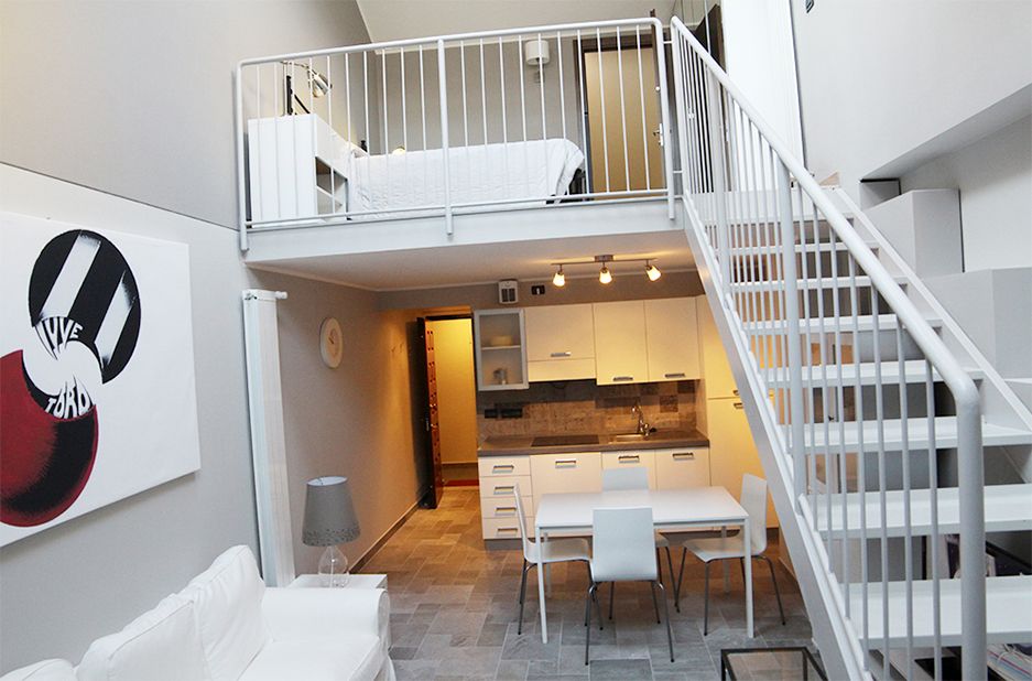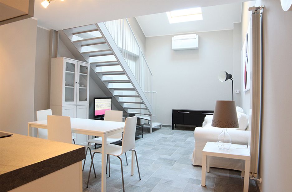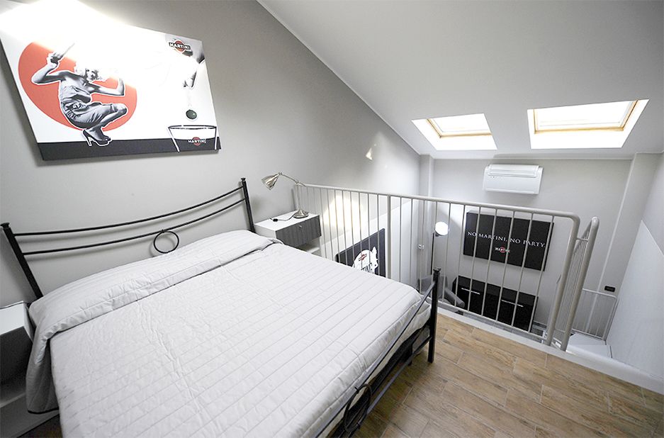 Questo LOFT, più spazioso degli altri, è disposto su due piani. E' composto da un ingresso dal quale si accede alla zona giorno suddivisa in zona salotto e zona pranzo, con tavolo per 4 persone e da una cucina completa di tutti gli elettrodomestici, frigorifero, lavapiatti, forno a microonde, piano cottura a induzione.