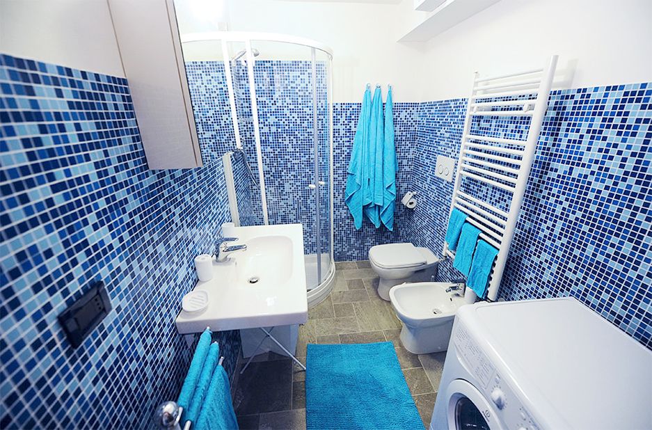 Il bagno è rivestito in mosaico ed ha sanitari di design, è completato da una lavatrice/asciugatrice.
